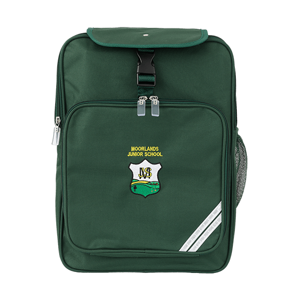 Bottle green junior backpack with embroidered Moorlands Junior School logo: