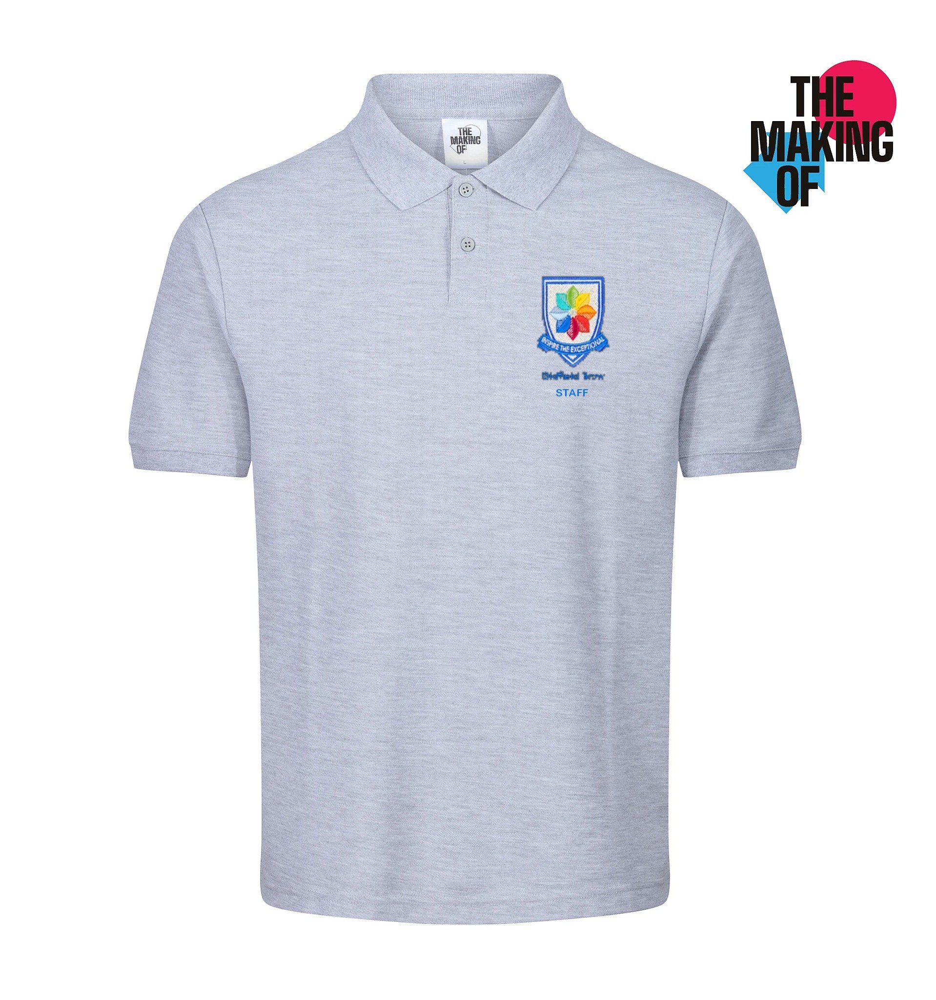 Heather grey staff classic polo shirt embroidered with the Oldfield Brow primary school staff logo: