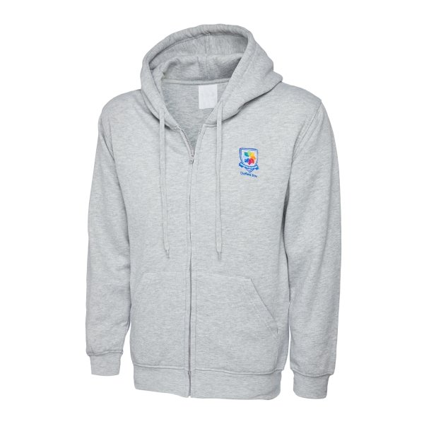 Heather Grey staff classic zipped hoodie embroidered with the Oldfield Brow primary school staff logo: