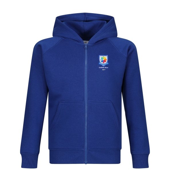 Royal blue staff classic zipped hoodie embroidered with the Oldfield Brow primary school staff logo: